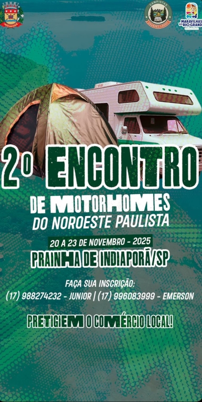 Prepare-se para um dos maiores eventos de turismo sobre rodas da região! De 20 a 23 de novembro de 2025, a Prainha Municipal de Indiaporã/SP será palco do 2º Encontro de Motorhomes do Noroeste Paulista, reunindo motorhomes, trailers, vans e barracas para dias de integração, lazer, gincana, bingo e música ao vivo.